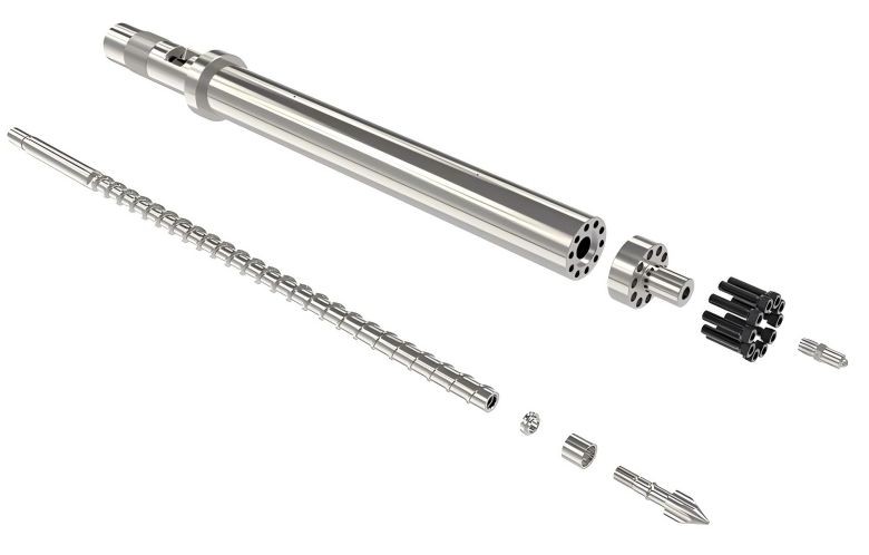 Screw Size: 45mm Accessories: Screw Tip, Rings, Nozzle Head, Cooling Rings, Barrel Nut. Delivery time: 20-25 days Base Materials: SACM645,SCM440,SKD61 Treatment: Nitrided & Bimetallic Hardness: HRC60 12 Months Guarantee