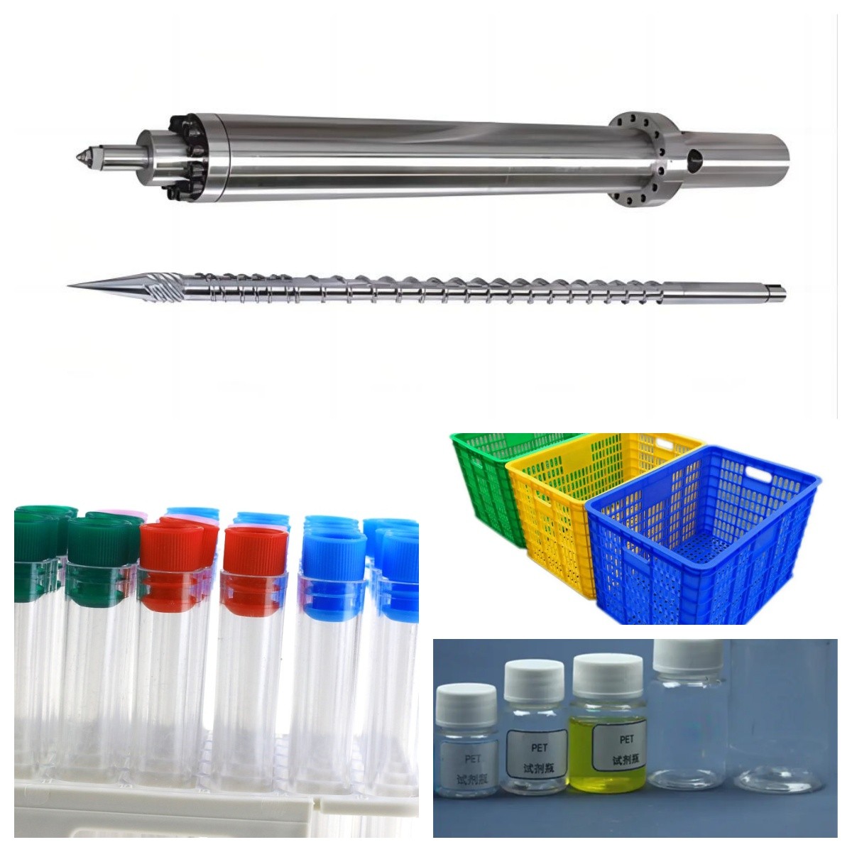 Screw diameter: 65mm 75mm Screw L/D ratio:23.9 20.7 Accessories: Screw head, Rings, Nozzle Tip Set Base Materials: SACM645,SCM440,SKD61 Steel Process: Nitrided & Bimetallic & Chrome Hardness: HRC55-65 Suitable for: PP, PE, ABS, PET, PVC, PS ... Delivery time: 20-25 days