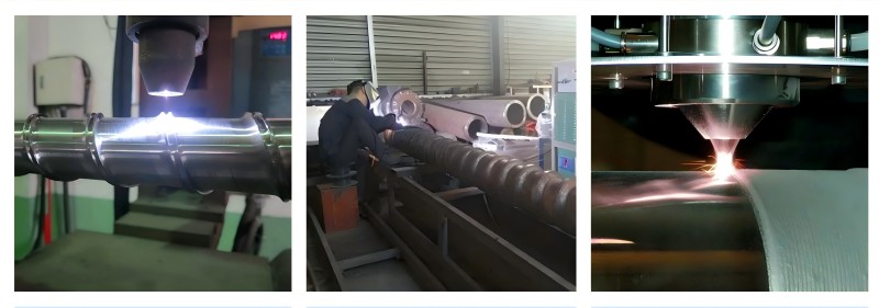 Bimetallic Screw | SACM645 Steel, top spray weld Tungsten carbide-based alloy | Transparent products, PA6, PA66 and other Engineering materials with fibers | Surface hardness is about HRC60°, Alloy layer thickness is 0.8-2.5mm, and it is wear-resistant |